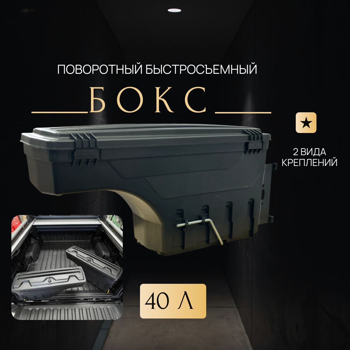 Поворотный бокс — это аксессуар для пикапа, который позволяет организовать хранение вещей в кузове с удобным доступом. Он устанавливается в мёртвую зону кузова, не занимая полезного пространства, и обеспечивает быстрый доступ к содержимому без необходимости залезать в кузов